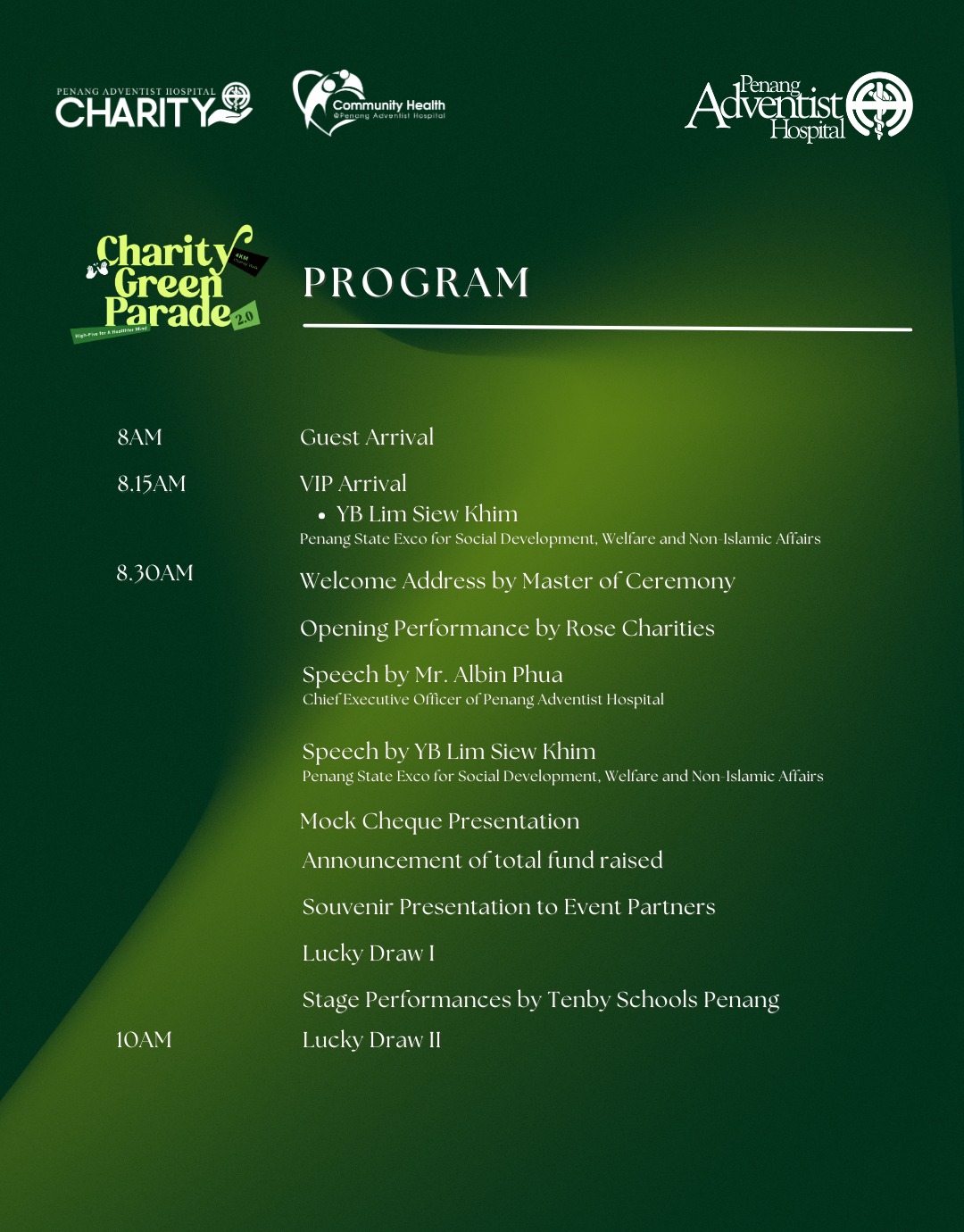 As at November 2025, a total of RM 572,555 was disbursed as medical subsidy through our Dr. J. Earl Gardner Fund to help 25 beneficiaries. The fund raised from Charity Green Parade 2.0 will help Penang Adventist Hospital Dr. J. Earl Gardner Fund for needy patients who need to undergo major surgeries.