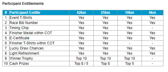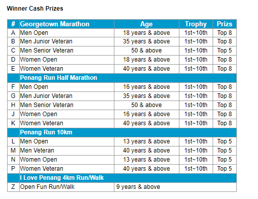 | Penang Run 10km | 55.00 | 65.00 | 75.00 |